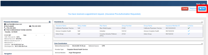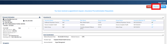 Respond: Recipients can respond to the referral by selecting the blue “Response” Button, located at the top right and bottom right of the page.