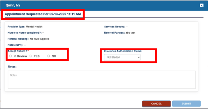 - No - Let the sender know that you cannot accept the patient, with an option to state why; this helps the sender better organize care elsewhere.